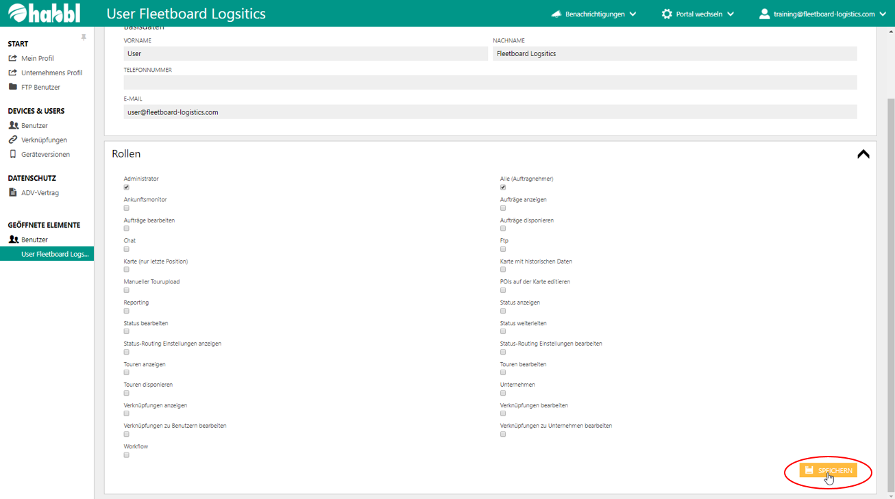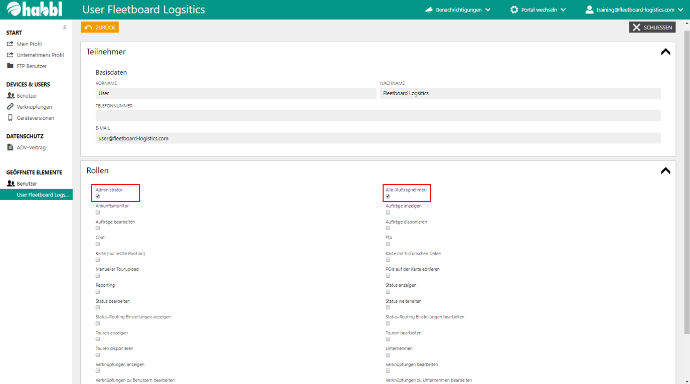 Bitte beachten Sie, dass kein Benutzer seine eigenen Rollen ändern oder erweitern kann. Wenn Sie Ihre Rollen erweitern oder ändern möchten, wenden Sie sich bitte an den Administrator für habbl in Ihrem Unternehmen oder wenden Sie sich an das Fleetboard Logistics Team, um den richtigen Support zu erhalten. Sie erreichen unser Support-Team über den Fleetboard Logistics Service Desk (support.fleetboard-logistics.com) oder über eine E-Mail an support@fleetboard-logistics.com.