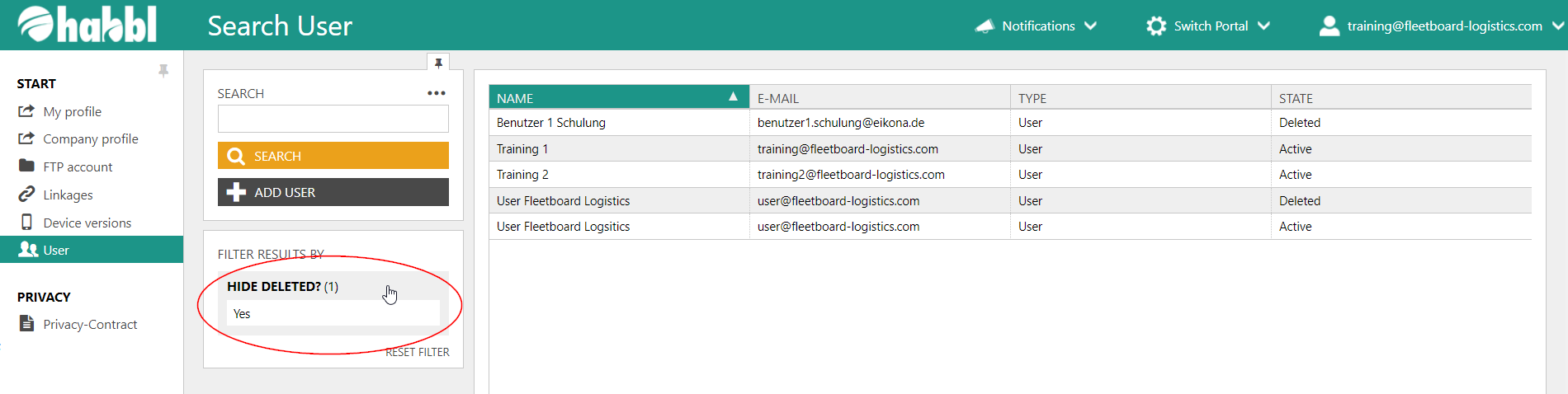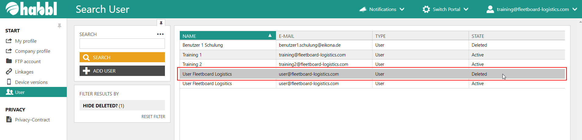 Please note that users can currently only be deleted by Fleetboard Logistics Support. To delete existing users, please open a ticket via the Fleetboard Logistics Service Desk at support.habbl.com or send an email to support@habbl.com.