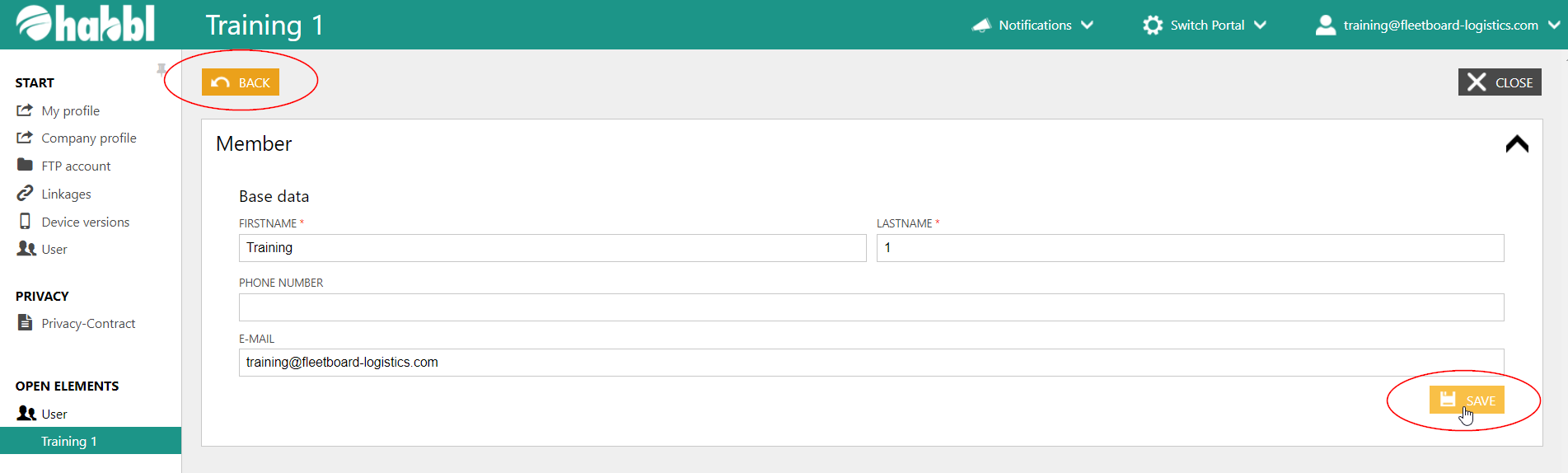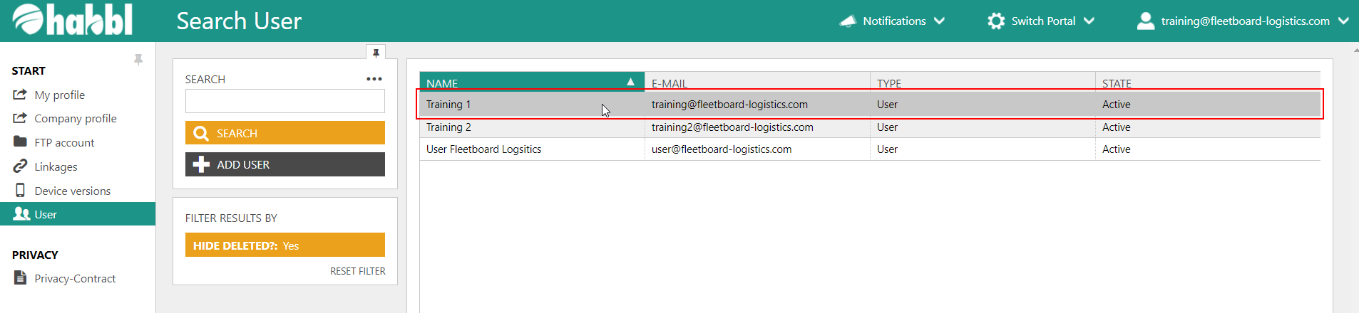 - Select an existing user from the user list. In this example we choose the User Training 1.