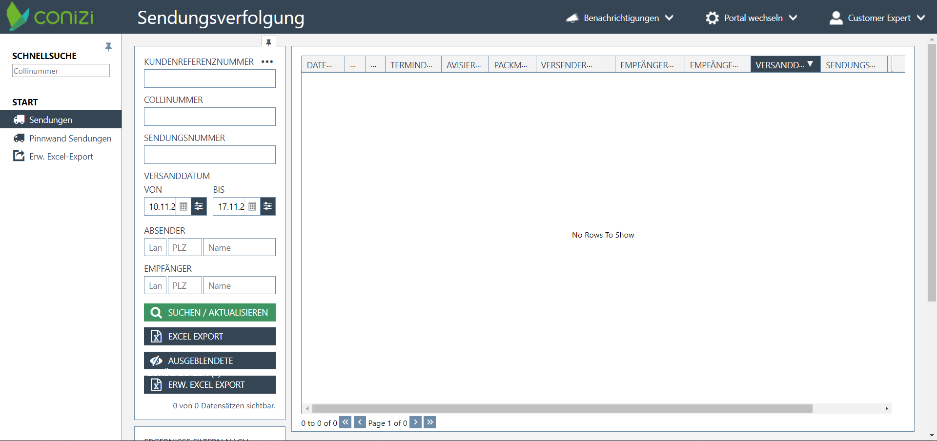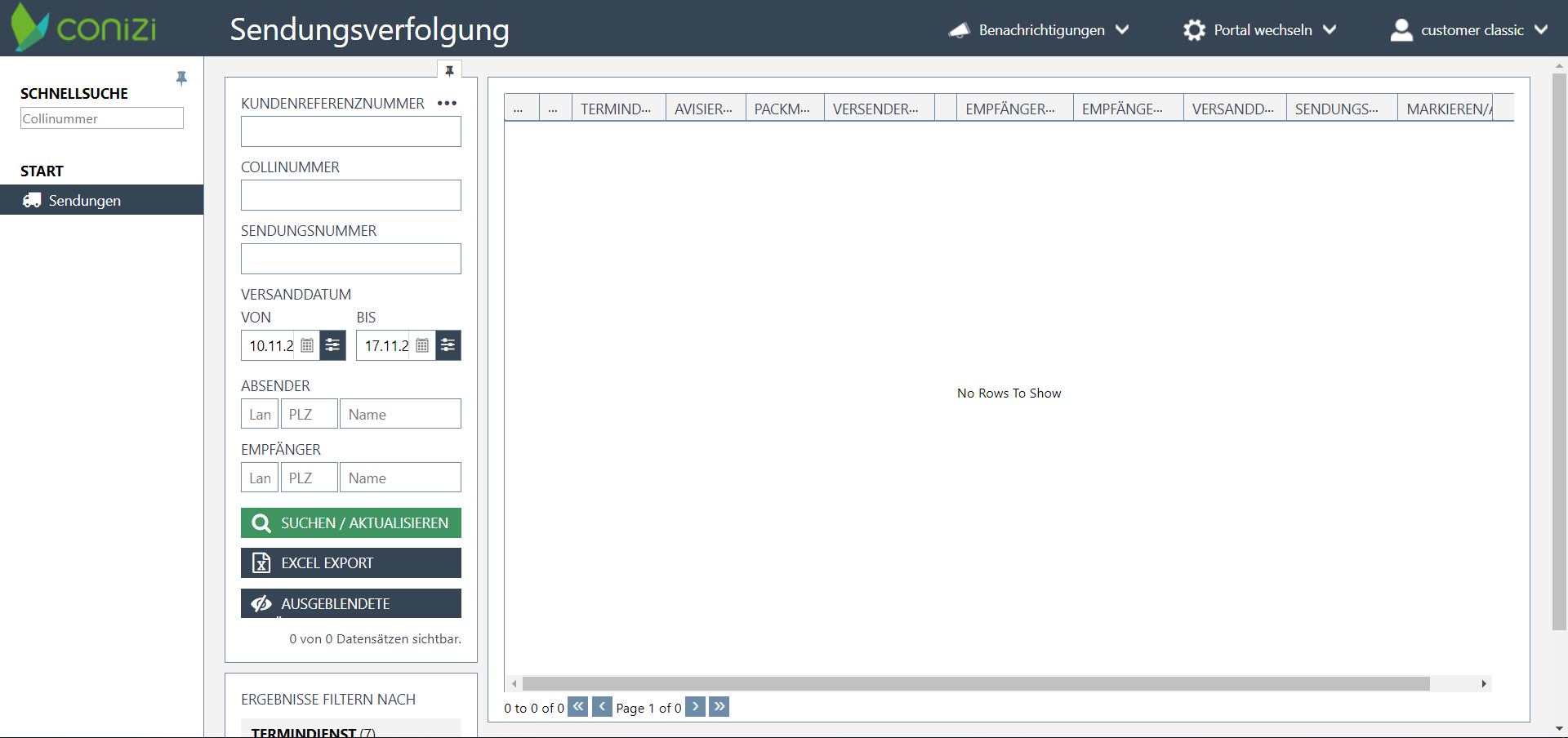 Mit der Rolle Customer Classic erhalten Benutzer den minimalsten Funktionsumfang. Außer dem Einblick in die Sendungen und dem Excel-Export stehen nur wenige Features zur Verfügung