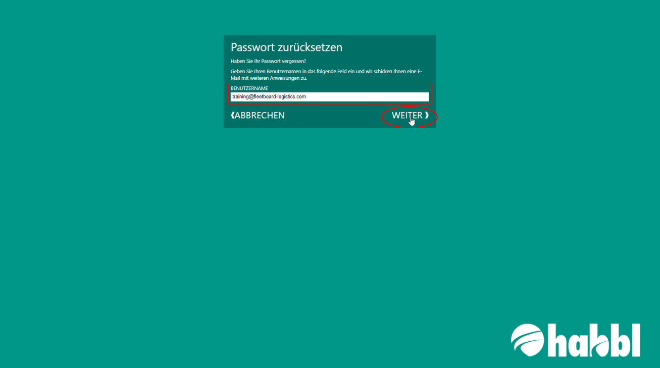 Geben Sie Ihren Benutzernamen ein. Der Benutzername ist die E-Mail, mit der Sie sich im Portal registriert haben und klicken Sie auf WEITER.